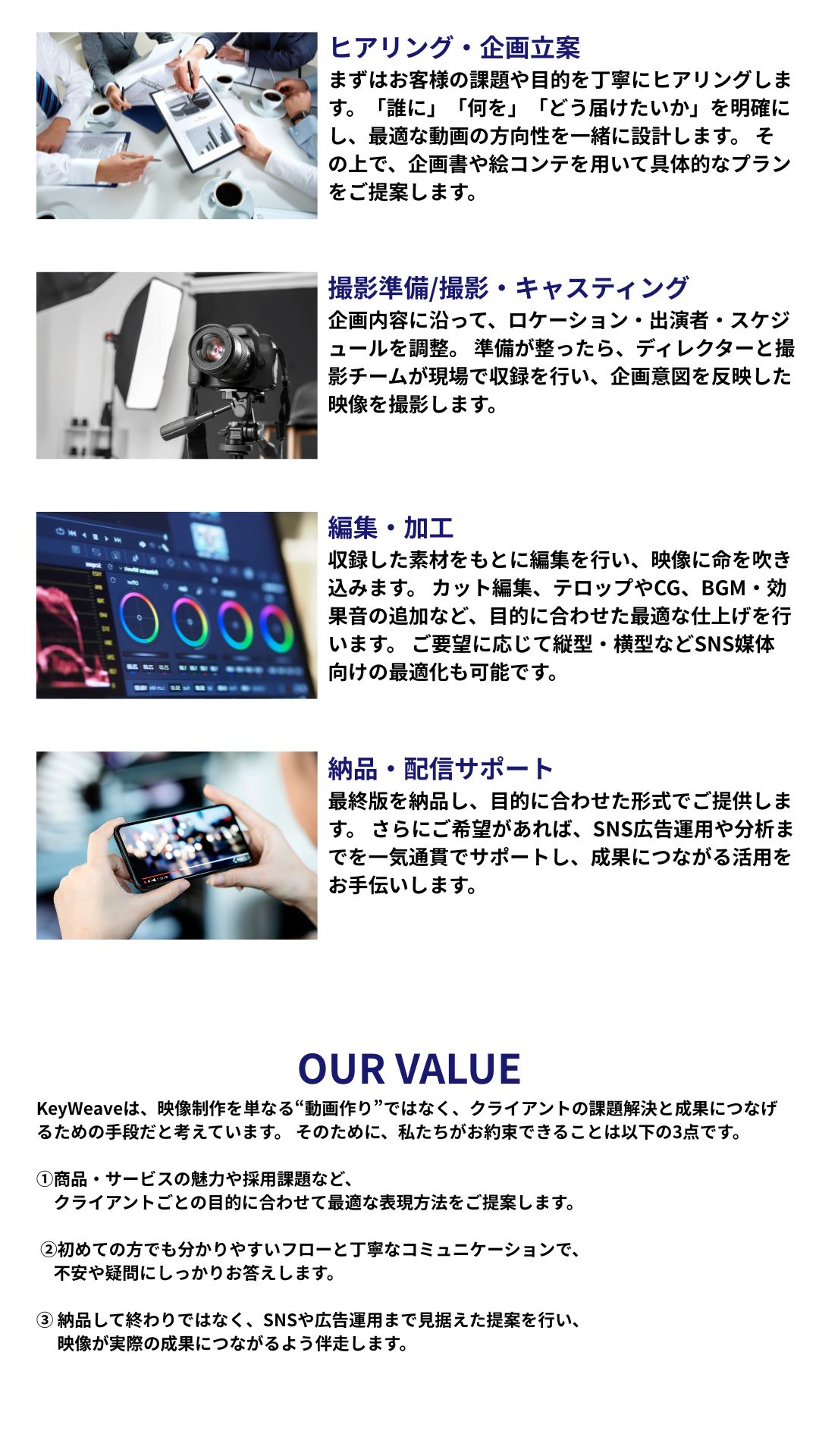 映像で心を動かす。言葉を超える体験を届ける。 映像には、言葉では伝えきれない熱量や空気感を届ける力があります。 一瞬の表情や空気の揺らぎ、音の響きや光の陰影——そのすべてが重なり合い、観る人の心を揺さぶります。 私たちが目指すのは、単に「情報を伝える映像」ではありません。 企業やサービスが秘めている物語を掘り起こし、映像という形で「共感」に変えること。 視聴者の心に残り、行動へとつながる体験を生み出すことです。 だからこそ、私たちは企画から撮影・編集に至るまで、細部に妥協せず、映像に込めるメッセージを徹底的に磨き上げます。 映像を通じて、人と人、人とブランドが新たにつながる。 その瞬間こそが、私たちが映像制作に取り組む最大の原動力です。 OUR SERVICE ご依頼・ご要望などの各種お問い合わせは、以下のフォームをご記入の上、ご連絡ください。 通常ですと2~3営業日で折り返しのご連絡を差し上げております。 氏名 (必須) 会社名 (必須) メールアドレス (必須) 電話番号 (必須) 題名 メッセージ本文 Δ